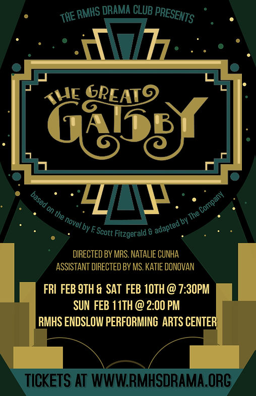The Great Gatsby presented by The RMHS Drama Club. This 30-minute one-act play based on the novel by F. Scott Fitzgerald was adapted by the RMHS Drama Club for its participation in the METG High School DramaFest competition in March. It will premiere at the RMHS Performing Arts Center February 9-11. Open the community.